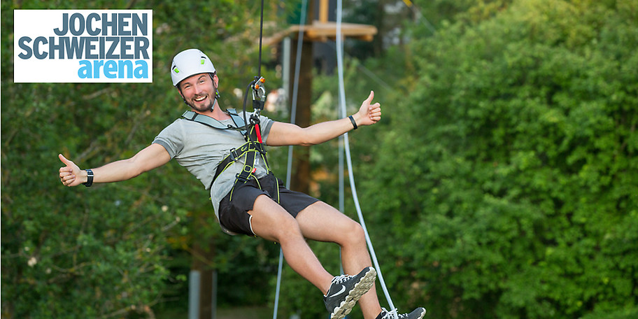 Im Outdoorpark der Jochen Schweizer Arena gibt es sehr viel zu erleben! Mit dem ALL-IN Outdoor XL Paket können Sie sich auf allen Attraktionen austoben. Im SkyTrail, unserem Hochseilgarten, meistern Sie wackelige Hindernisse und klettern in einer Höhe von bis zu 13 Metern. Im Flying Fox fliegen Sie mit waghalsigen Geschwindigkeiten durch die Lüfte. Direkt im Anschluss lassen Sie sich an der Abseilstation selbstständig von der obersten Plattform herab. Jetzt müssen Sie nur noch der Skyjump aus 12 Metern Höhe bewältigen, um sich zum Survival-König zu krönen.